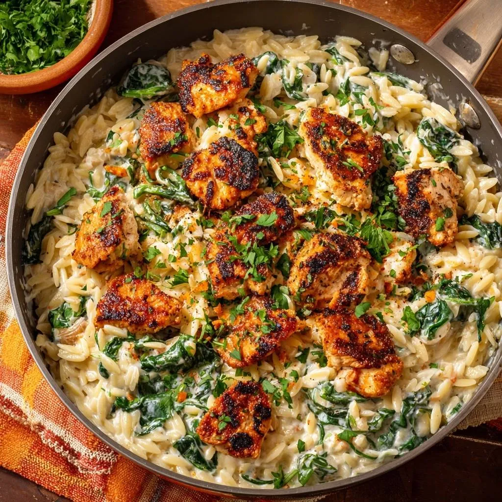 One-pan creamy spinach chicken orzo with foolproof technique for juicy, crispy-edged chicken in a rich Parmesan sauce.