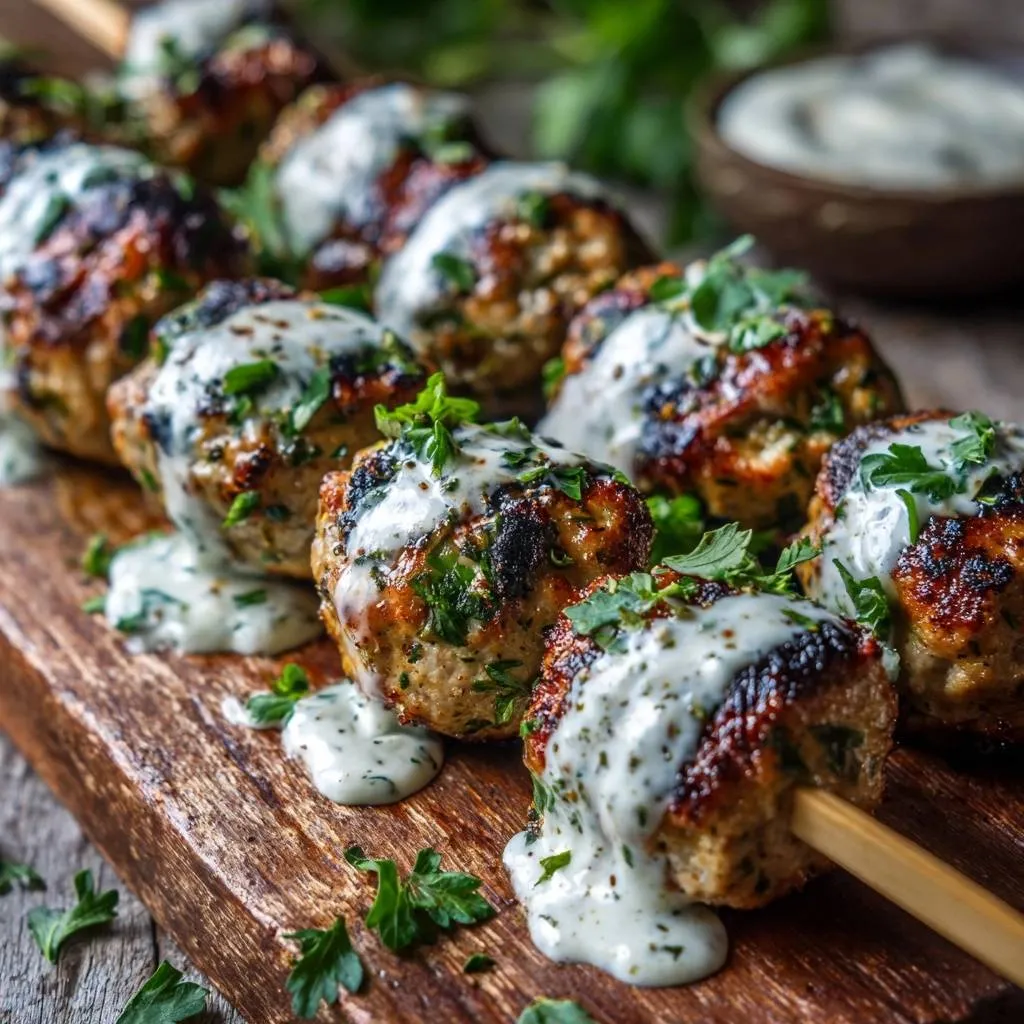 Succulent grilled chicken meatballs on skewers with fresh herbs, locked-in juices from a quick chill, served with creamy yogurt sauce.