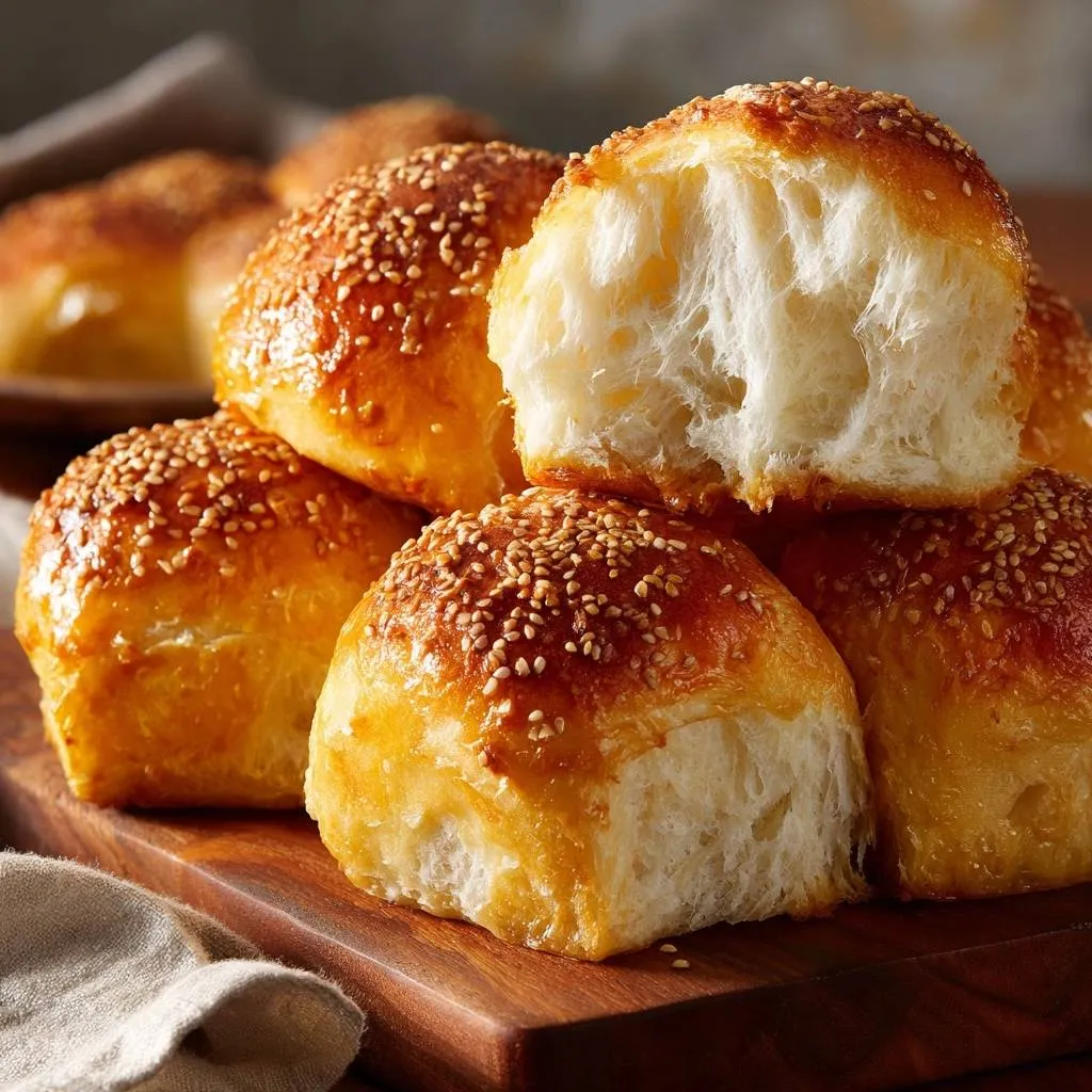 Fluffy dinner rolls using tangzhong starter for irresistible pull-apart texture, topped with shiny sesame seeds. Perfect for holidays.
