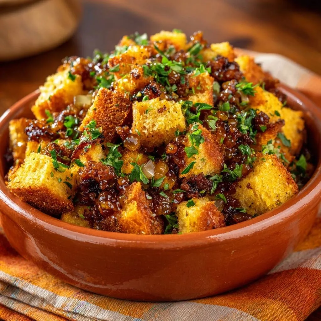 Foolproof crispy cornbread with caramelized onions and bacon. Toasted cubes stay golden-crisp, tossed with warm onions off-heat for perfect texture.