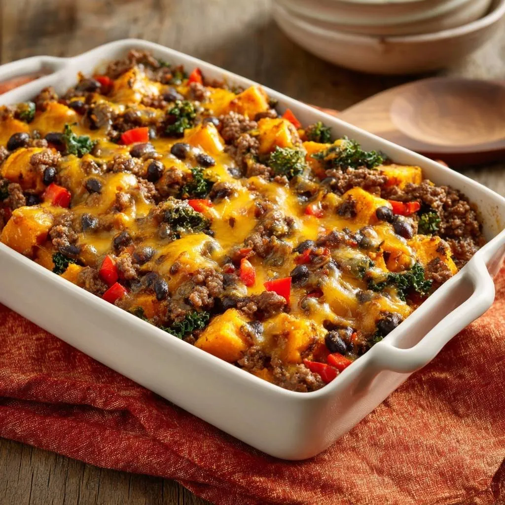 Hearty beef, black bean, kale, and red pepper bake with perfect tender-crisp sweet potato cubes and bubbly cheesy top.