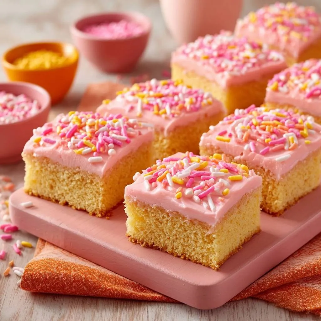 Light and fluffy pink sprinkle cake squares made with the reverse creaming method for the tenderest texture, topped with creamy pink frosting and rainbow sprinkles. Perfect for parties!