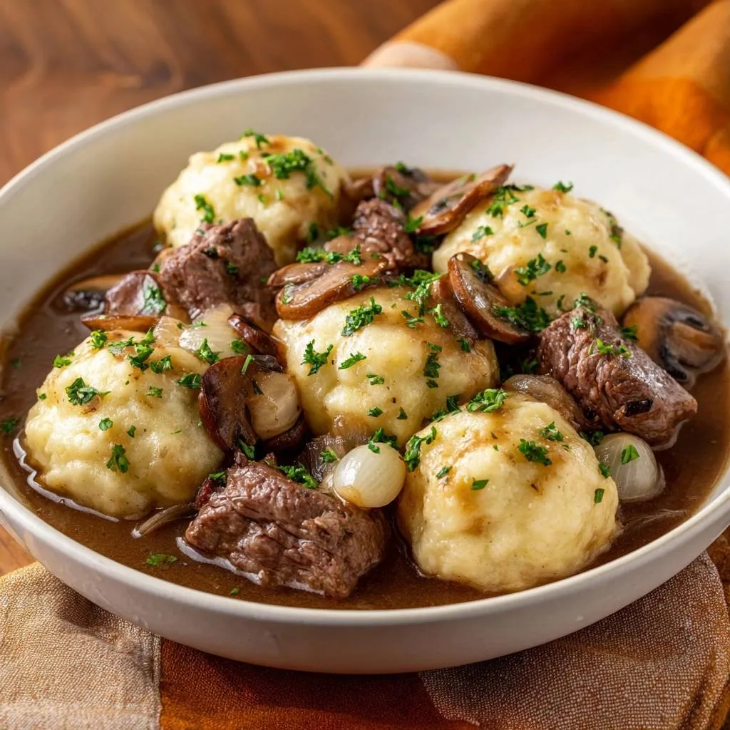 Foolproof hearty beef and mushroom stew with light, fluffy potato dumplings that stay perfect in gravy—no more gummy texture!