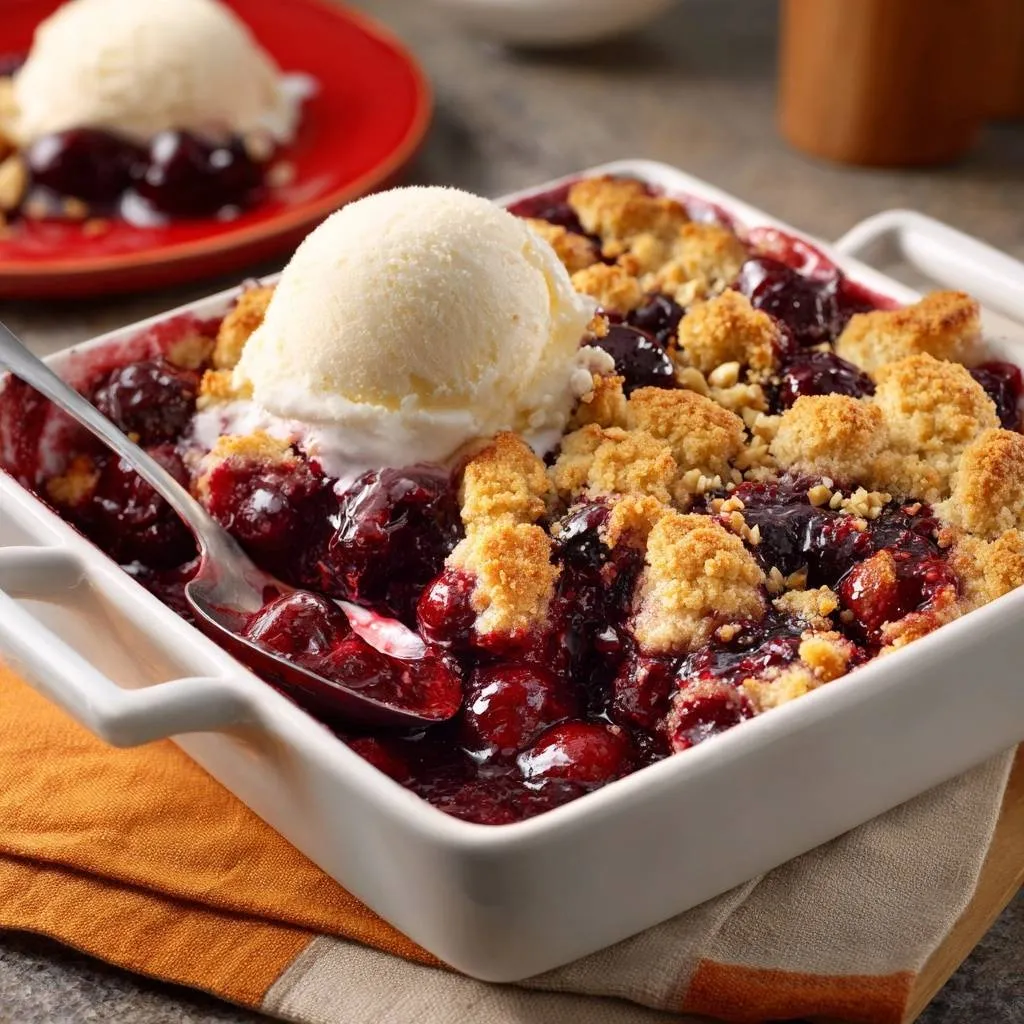 Shatteringly crisp nutty topping over juicy cherries, thickened with cornstarch to prevent sogginess. Perfect warm with vanilla ice cream.