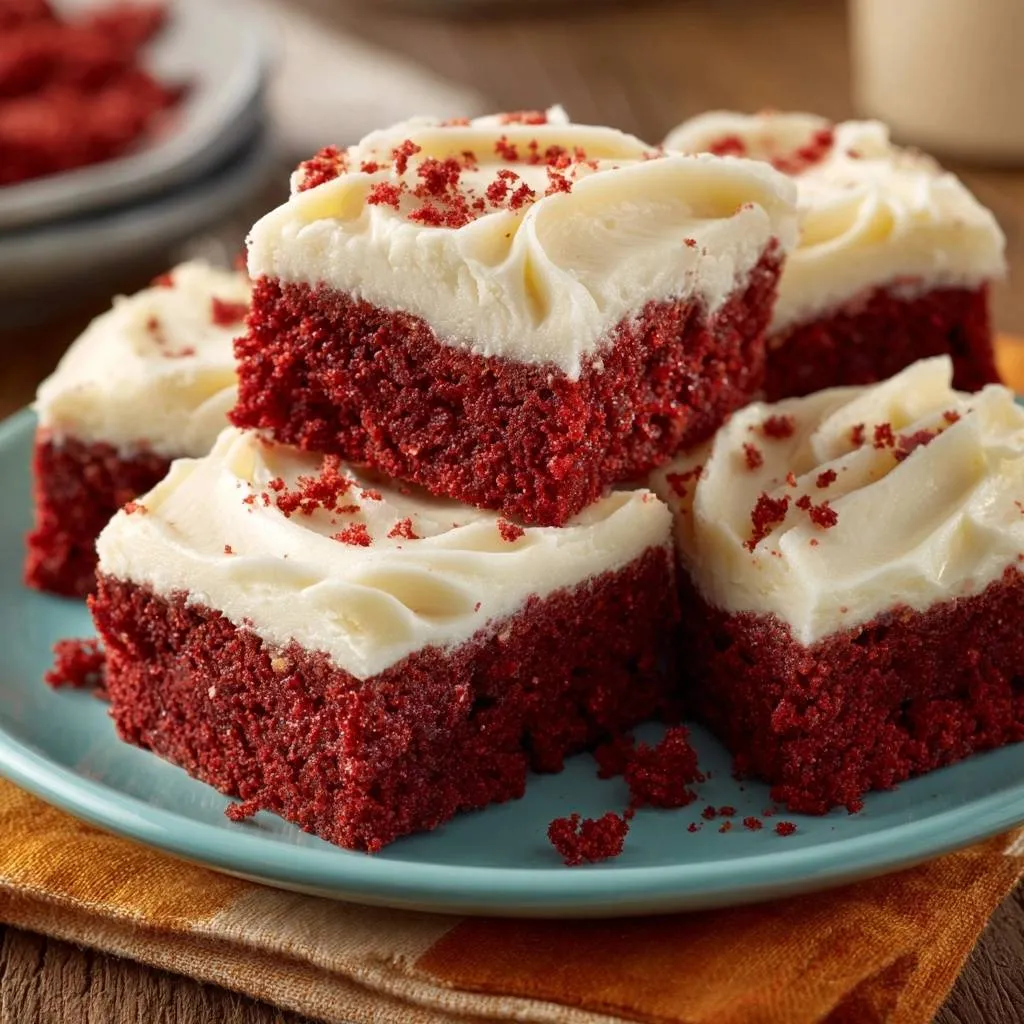 Moist red velvet cake squares made with vegetable oil for unbeatable tenderness, topped with cream cheese frosting and homemade cake crumbs.