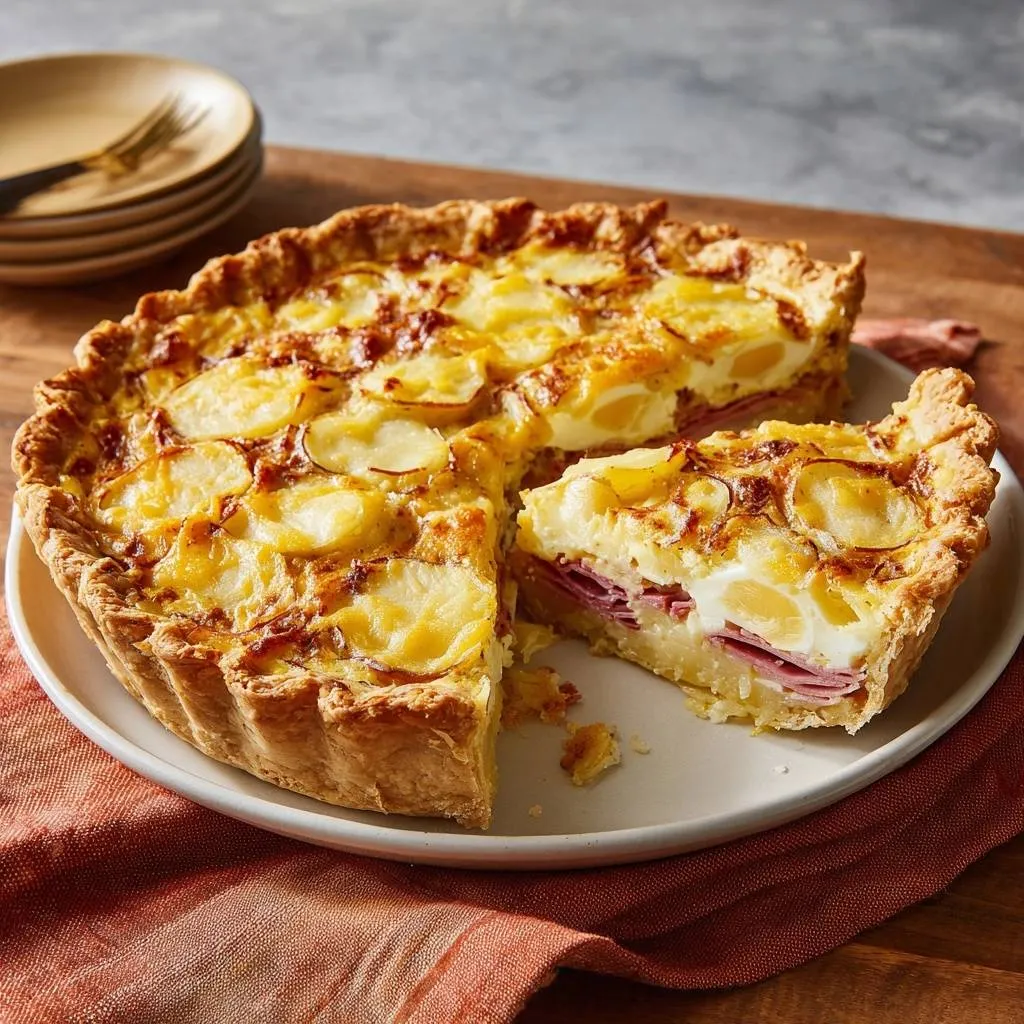 Foolproof quiche with shatteringly crisp crust using potato blanching to remove moisture, filled with ham, potatoes, and cheddar cheese.