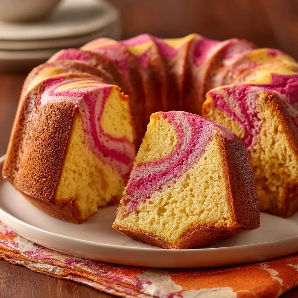 Vibrant pink and vanilla swirl bundt cake with a foolproof butter-flour pan release method for perfect nonstick results every time.