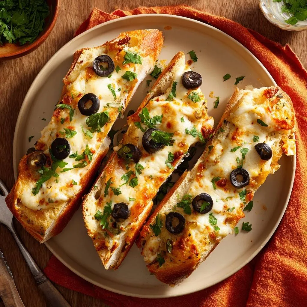 Foolproof crispy cheesy baguette topped with olives and herbs. Toasted bread stays crunchy under gooey melted cheese.