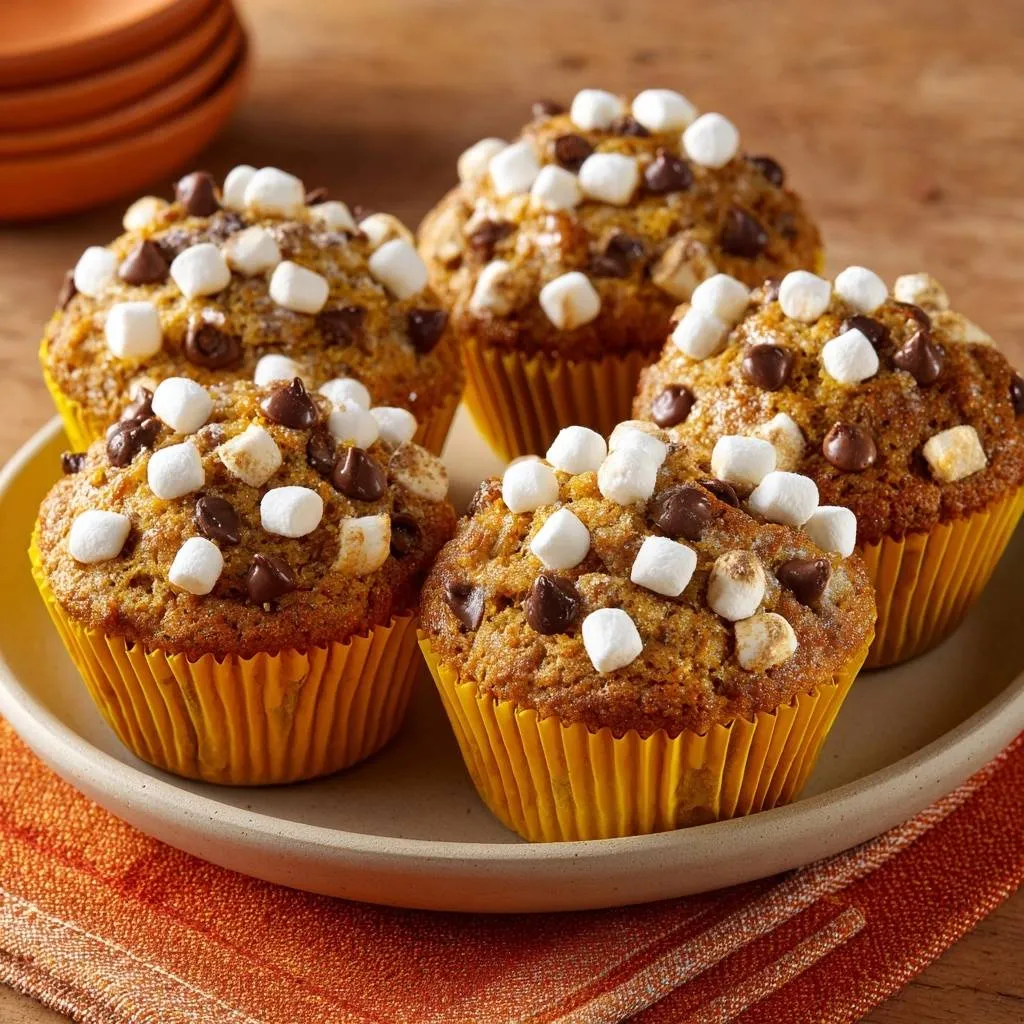 Light and tender pumpkin muffins with chocolate chips and marshmallows for s’mores flavor, using the foolproof muffin method to avoid dense texture.