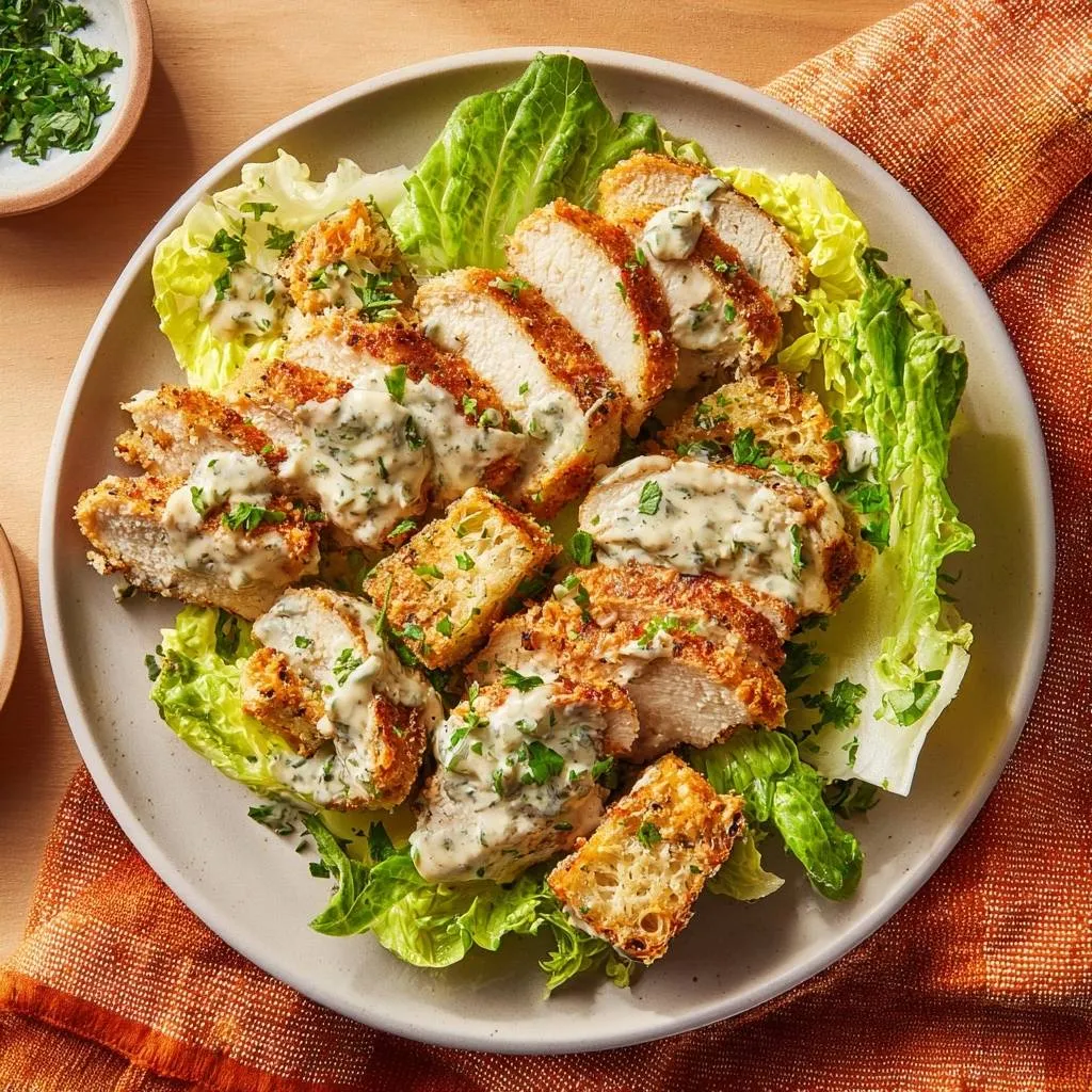 Tender, juicy breaded chicken pounded thin and fried crispy, served over lettuce with homemade croutons and creamy herb yogurt sauce. No more dry chicken!
