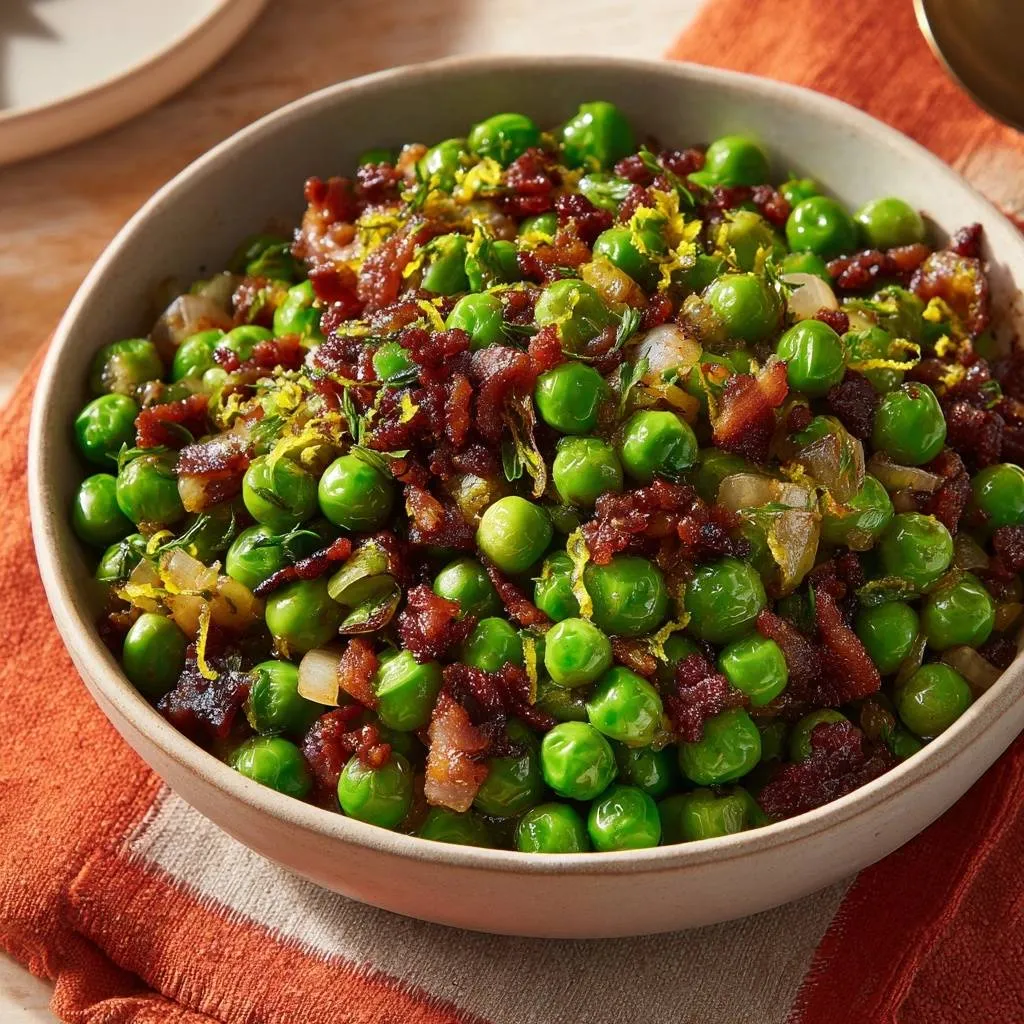 Tender-crisp peas tossed in bacon fat with crispy bacon, zesty lemon, and fresh dill for a perfect snap every time.