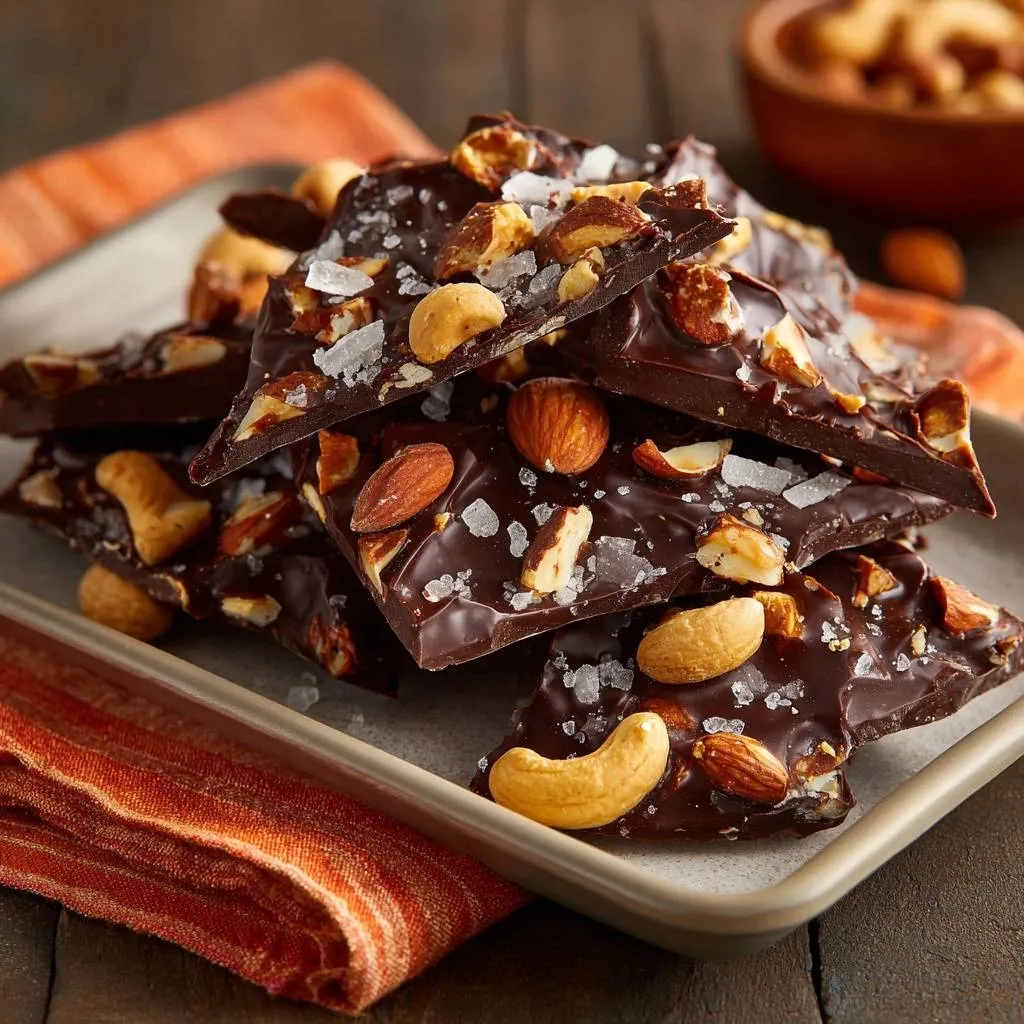 Shiny, snappy dark chocolate bark with roasted cashews, almonds, and flaky sea salt. Perfect no-fail method using seeding technique for firm texture that holds up all day.