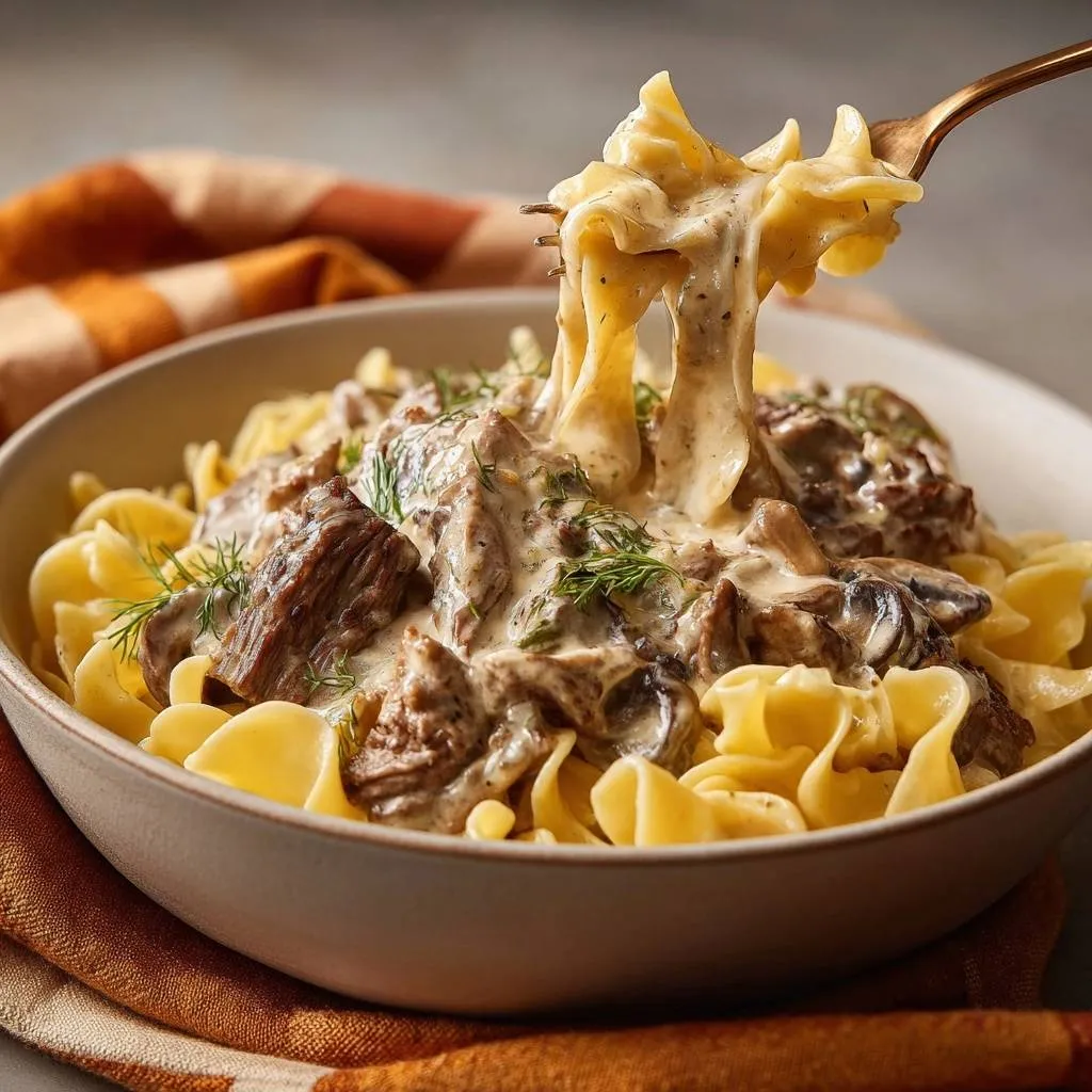 Tender beef stroganoff with bowtie pasta, cremini mushrooms, and creamy sour cream sauce. Thin slicing and quick-searing ensure melt-in-your-mouth beef every time.