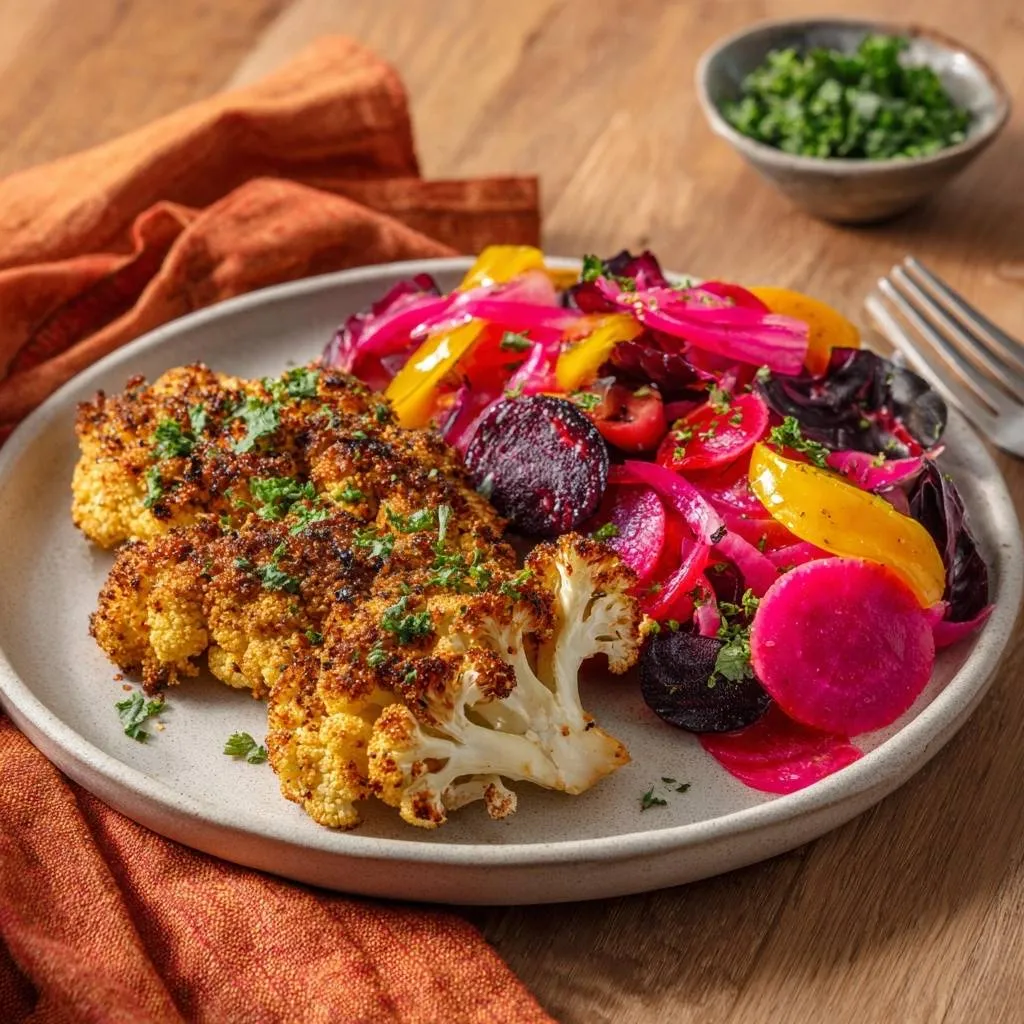 Crispy herb-crusted cauliflower roasted to perfection with a tangy pickled beet salad. Foolproof method prevents sogginess for ultimate veggie plate.