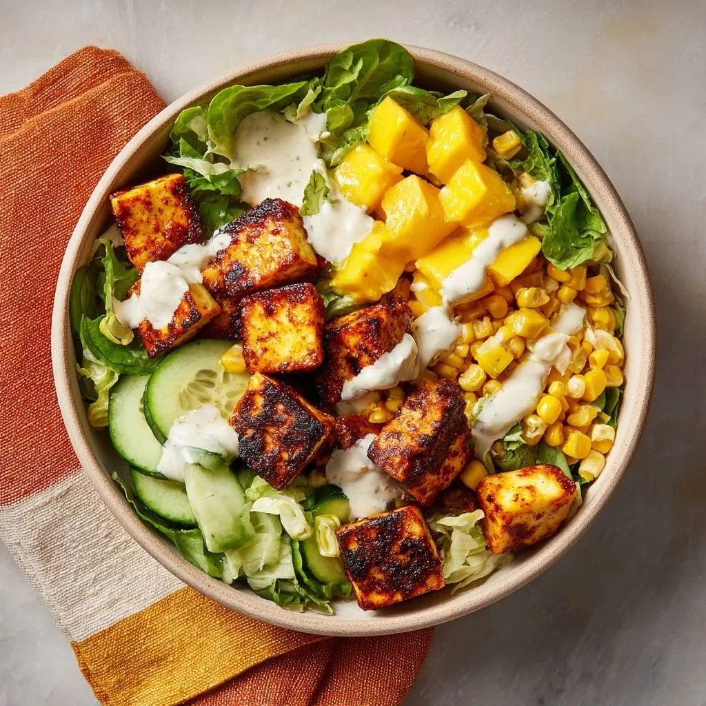 Crispy fried tofu with tropical mango, corn, cucumber, and romaine in a creamy lime yogurt dressing. No more soggy tofu!