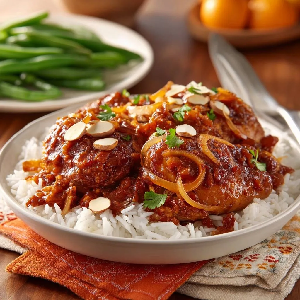 Tender bone-in chicken thighs with crispy skin in a glossy caramelized onion sauce, topped with toasted almonds and cilantro, served over rice.