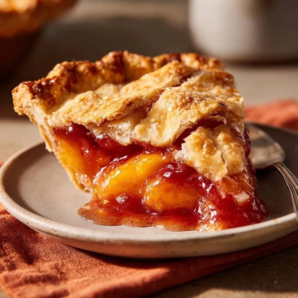 Stunning peach cherry pie with juicy fruit in a glossy, sliceable filling that holds perfect shape using a simple thickener trick—no gums or boil-overs.