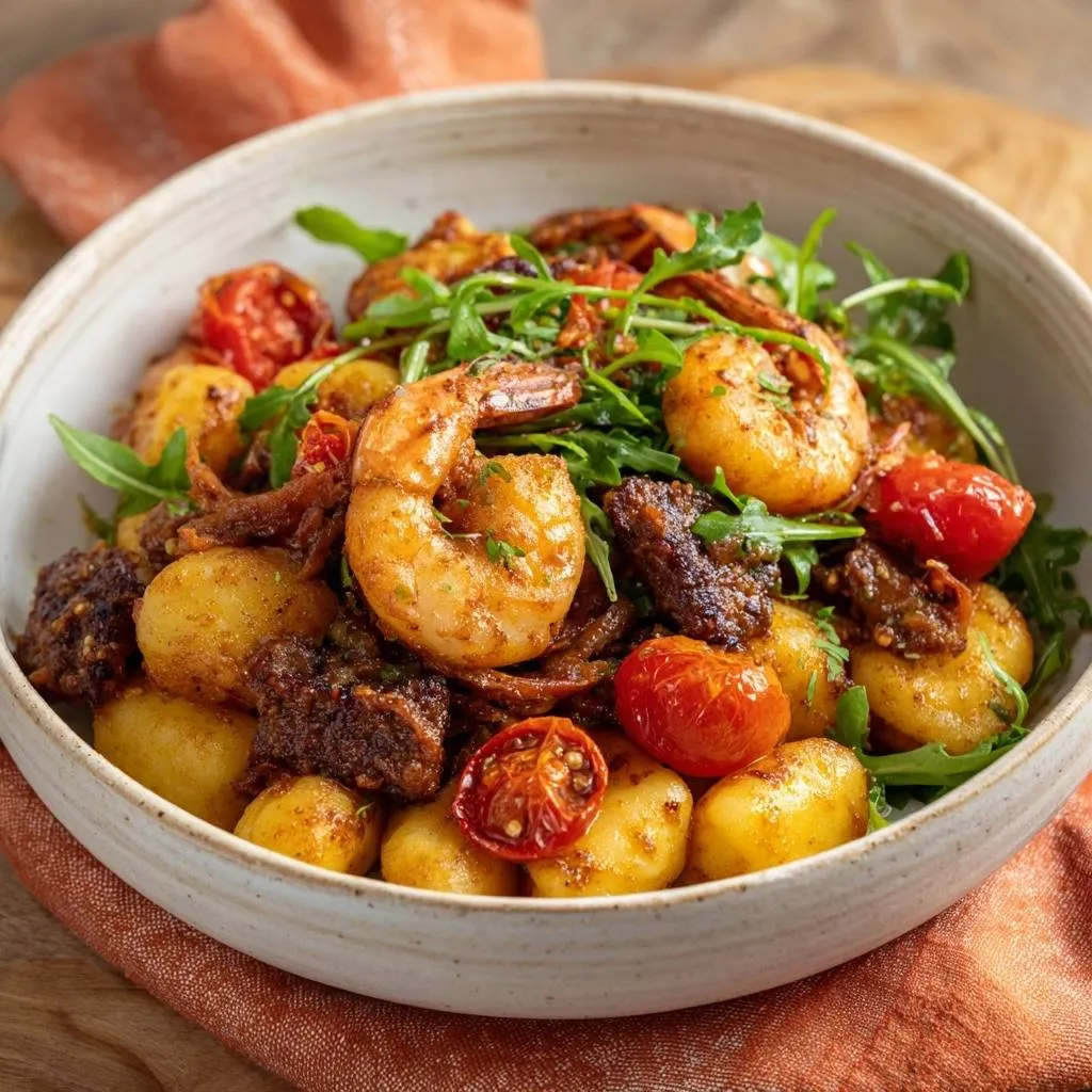Crispy pan-fried gnocchi with juicy shrimp, spicy sausage, blistered tomatoes, and peppery arugula in a one-pan meal. No boiling, no gummy gnocchi!