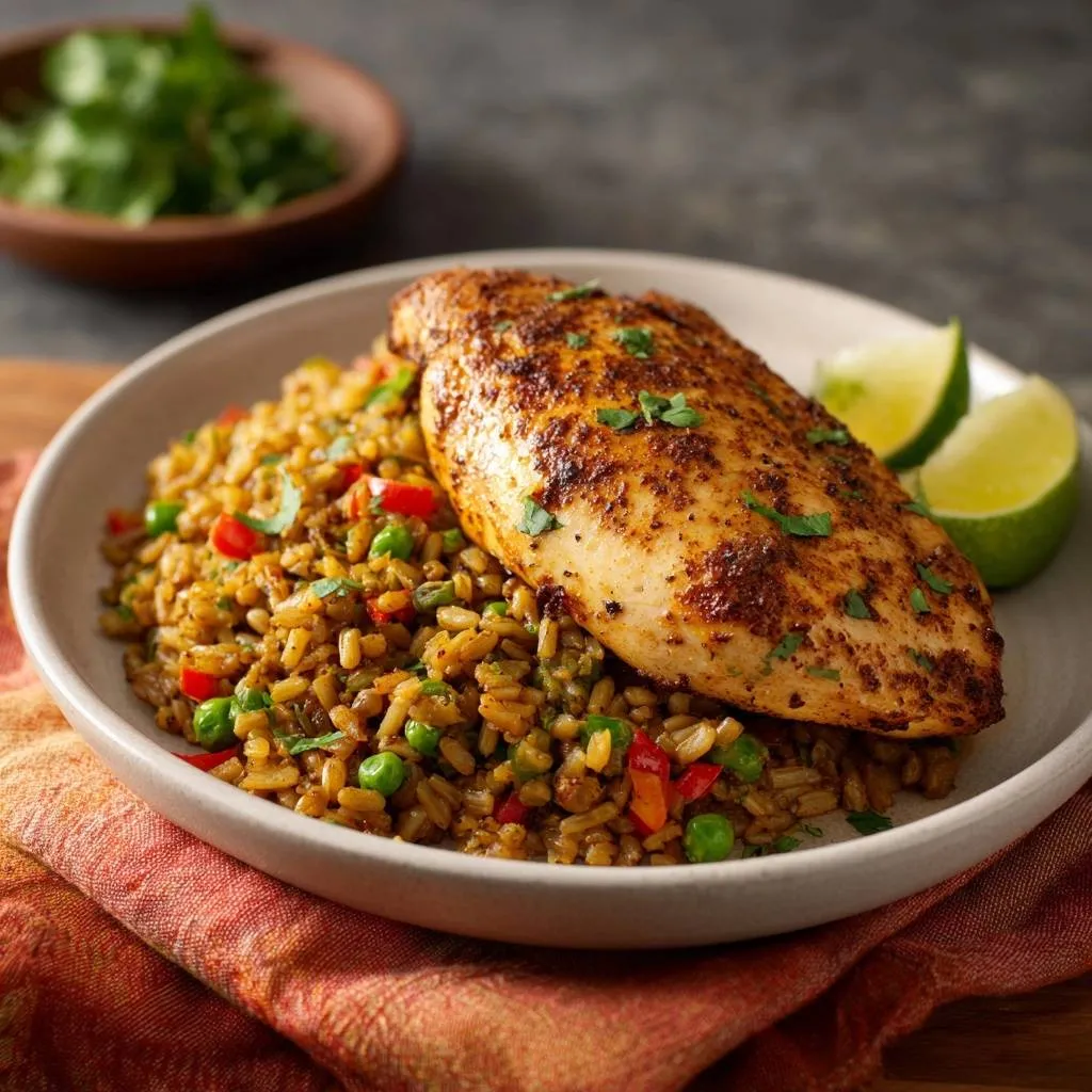 Juicy blackened chicken with a spicy crust served over fluffy cilantro lime fried rice with peas and peppers. No more dry chicken!