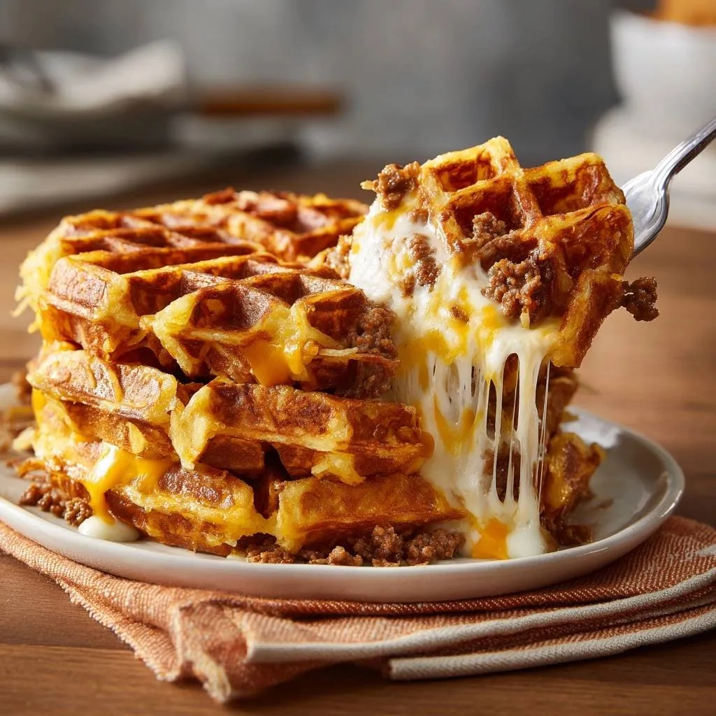 Crispy cheesy beef waffles with a foolproof fat-draining trick for fluffy centers and no sogginess.