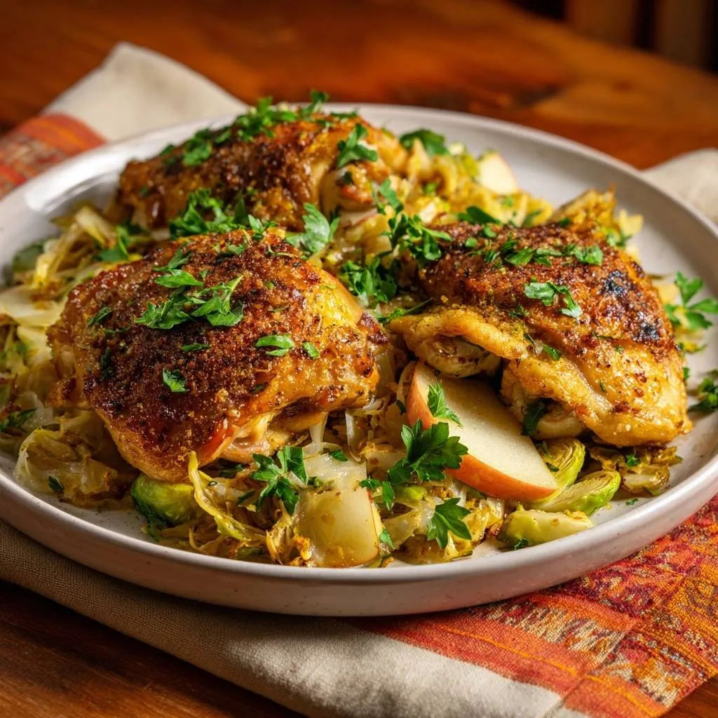 Ultra-crispy spiced chicken thighs with juicy apple-cabbage Brussels sprouts hash. Foolproof crispy skin every time!