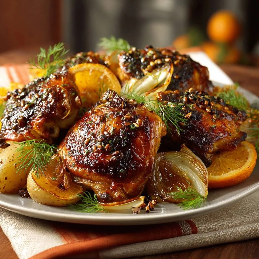Ultra-crispy skin chicken thighs glazed with orange and honey, roasted with potatoes, onions, and oranges for a juicy one-pan meal.