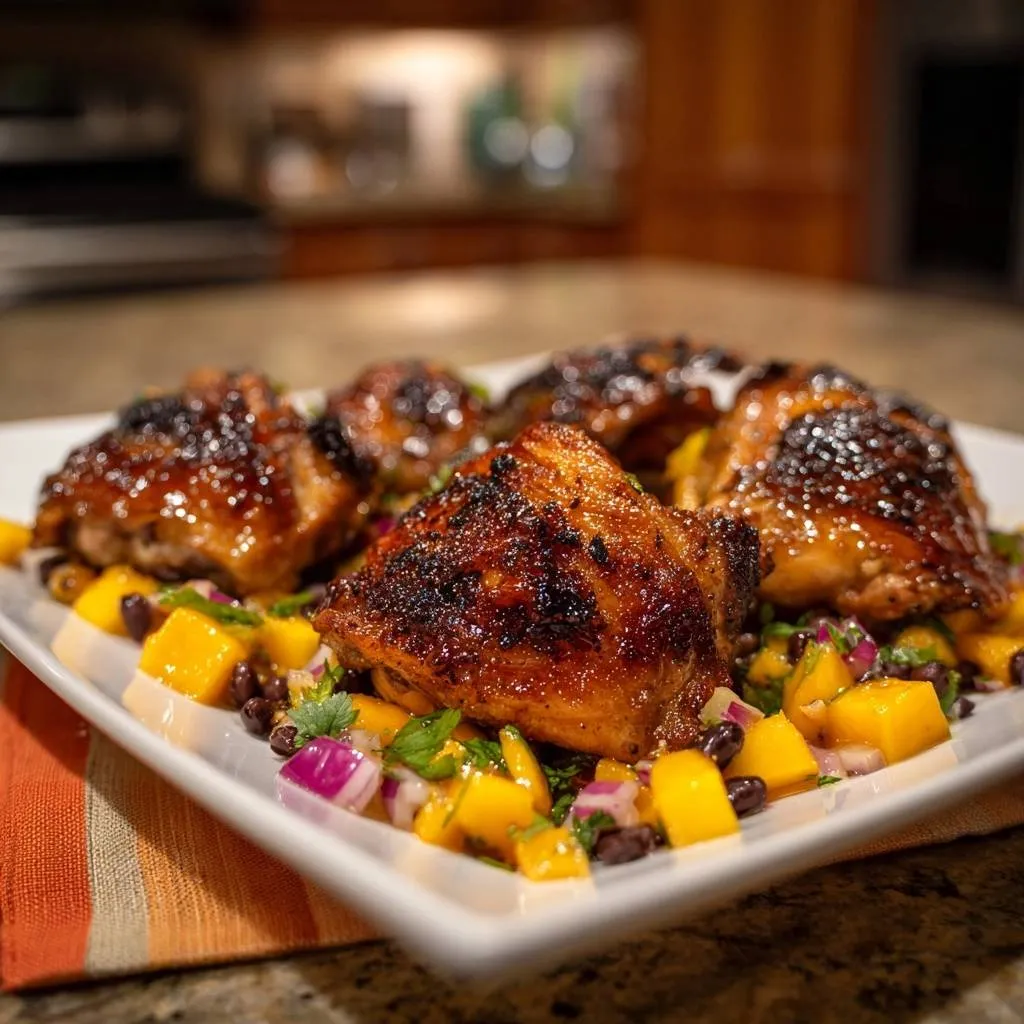 Juicy bone-in chicken thighs with sticky honey-soy glaze and crispy skin, paired with fresh mango black bean salsa for a tropical twist. Foolproof sear-then-bake method ensures never-dry chicken.
