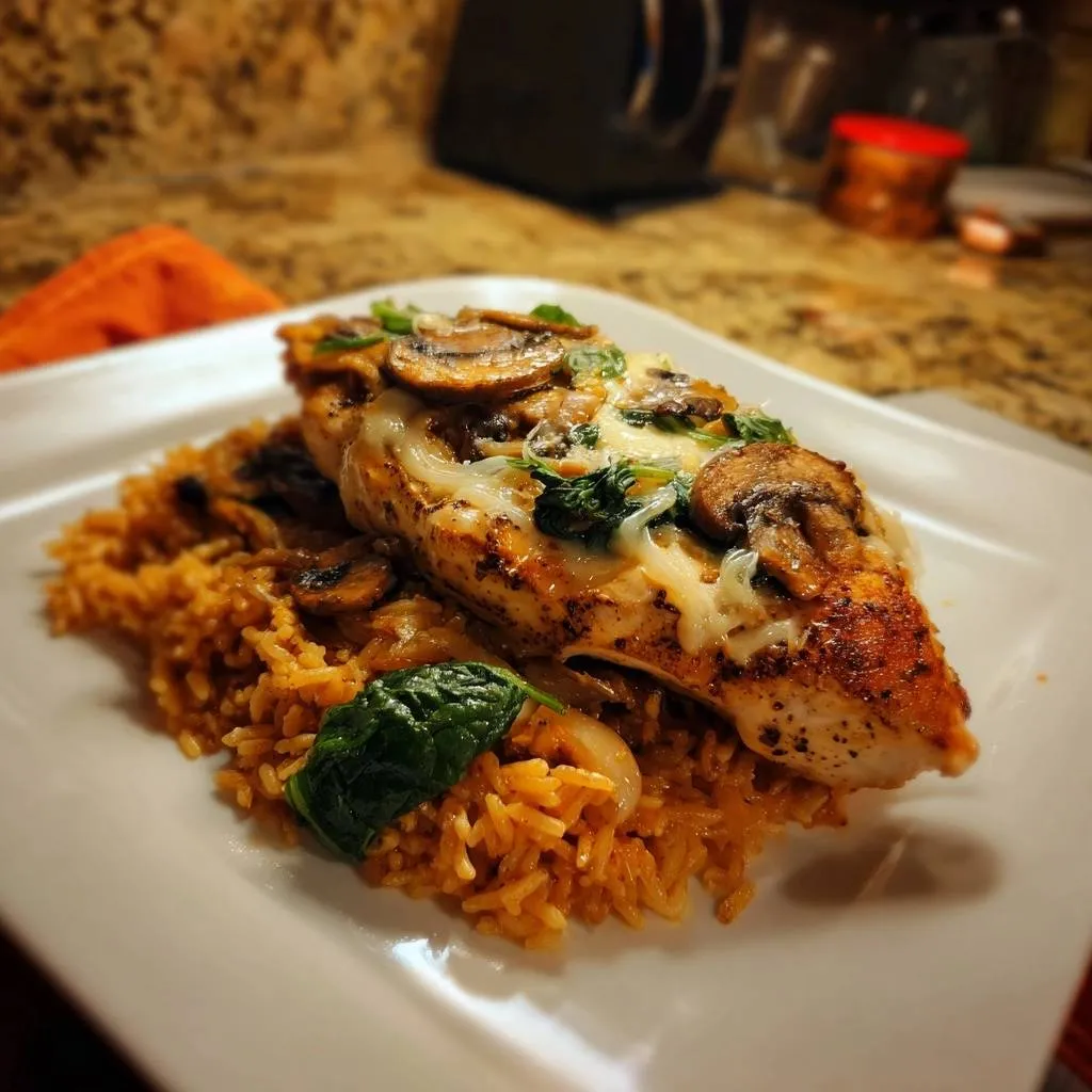 Cheesy Mushroom Spinach Chicken over Spanish Rice