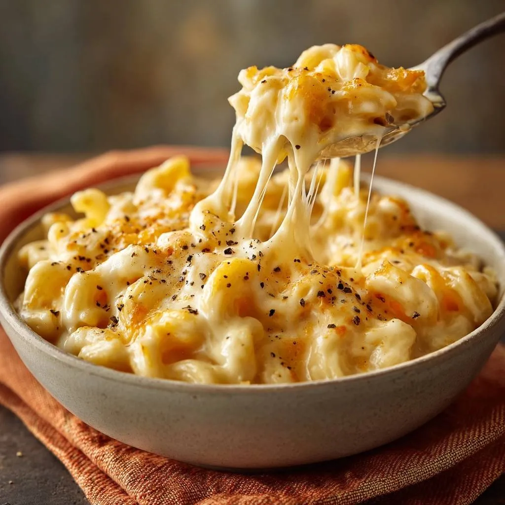 Perfectly smooth and stretchy baked mac and cheese with a foolproof trick to avoid grainy sauce: grate cheese cold and stir off heat.