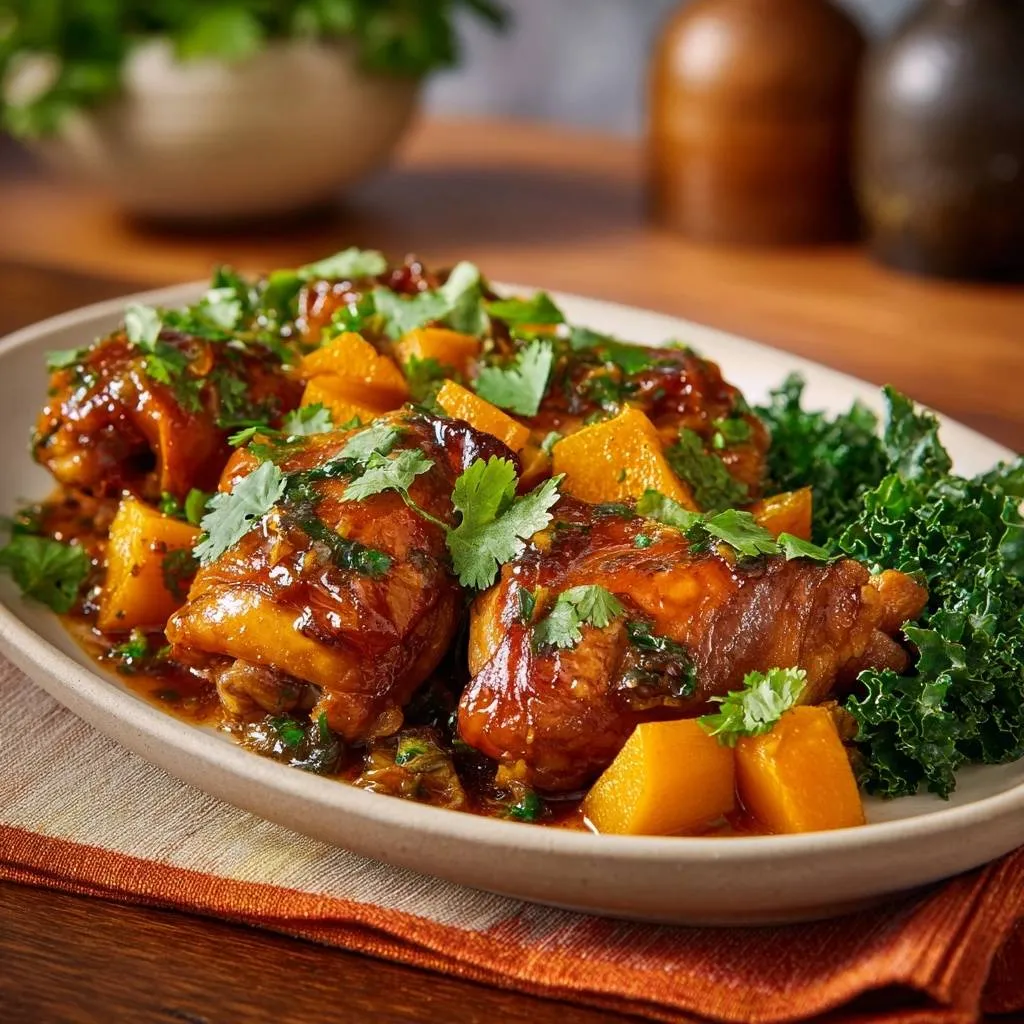 Tender, juicy bone-in chicken thighs glazed with a sticky soy-honey sauce, roasted with pumpkin and kale for a flavorful, foolproof dinner.