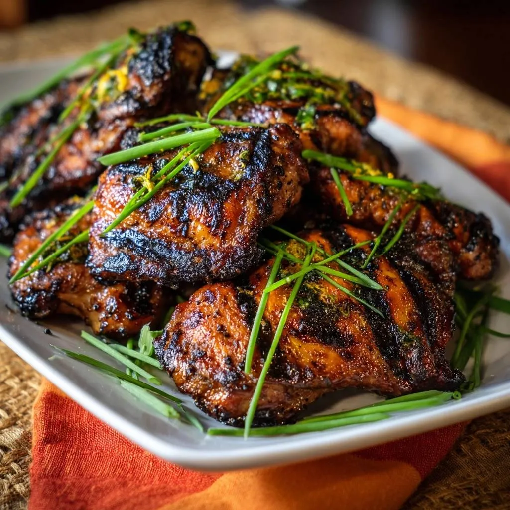 Juicy grilled chicken thighs with charred crispy skin, marinated in soy, honey, lemon, and scallions. Two-zone grilling method ensures no more dry meat.