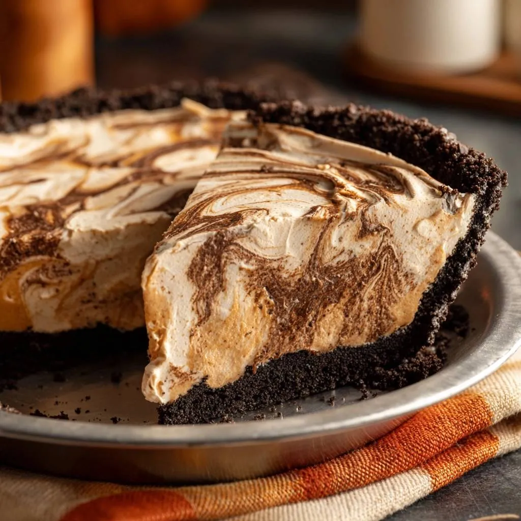 Foolproof no-bake Chocolate Peanut Butter Swirl Pie with stiff-peak whipping and gentle folding for perfect firm slices every time.