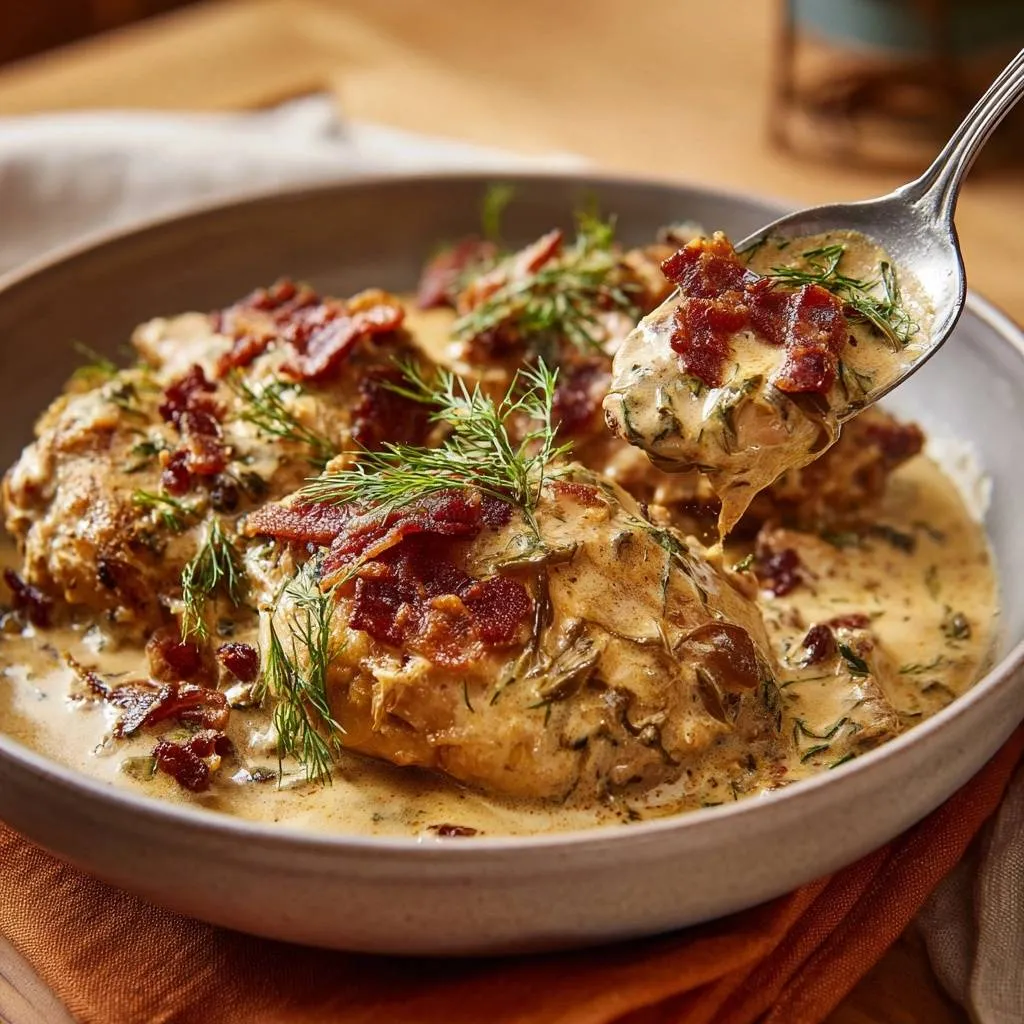 Tender, juicy chicken thighs seared to perfection and simmered in a creamy bacon and dill sauce. No more dry chicken!