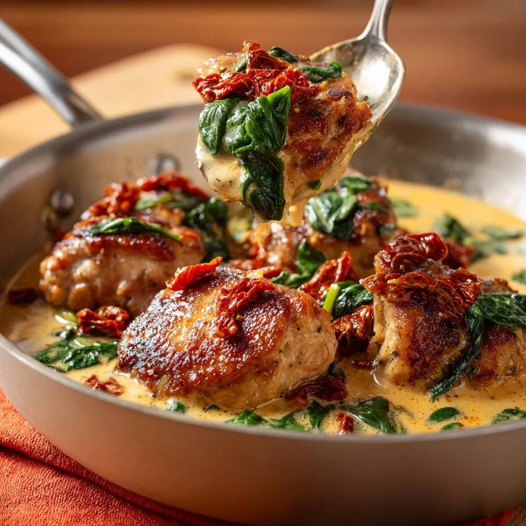 Tender, juicy chicken thighs in a creamy sun-dried tomato and spinach sauce. High-heat sear locks in moisture for the perfect skillet dinner.