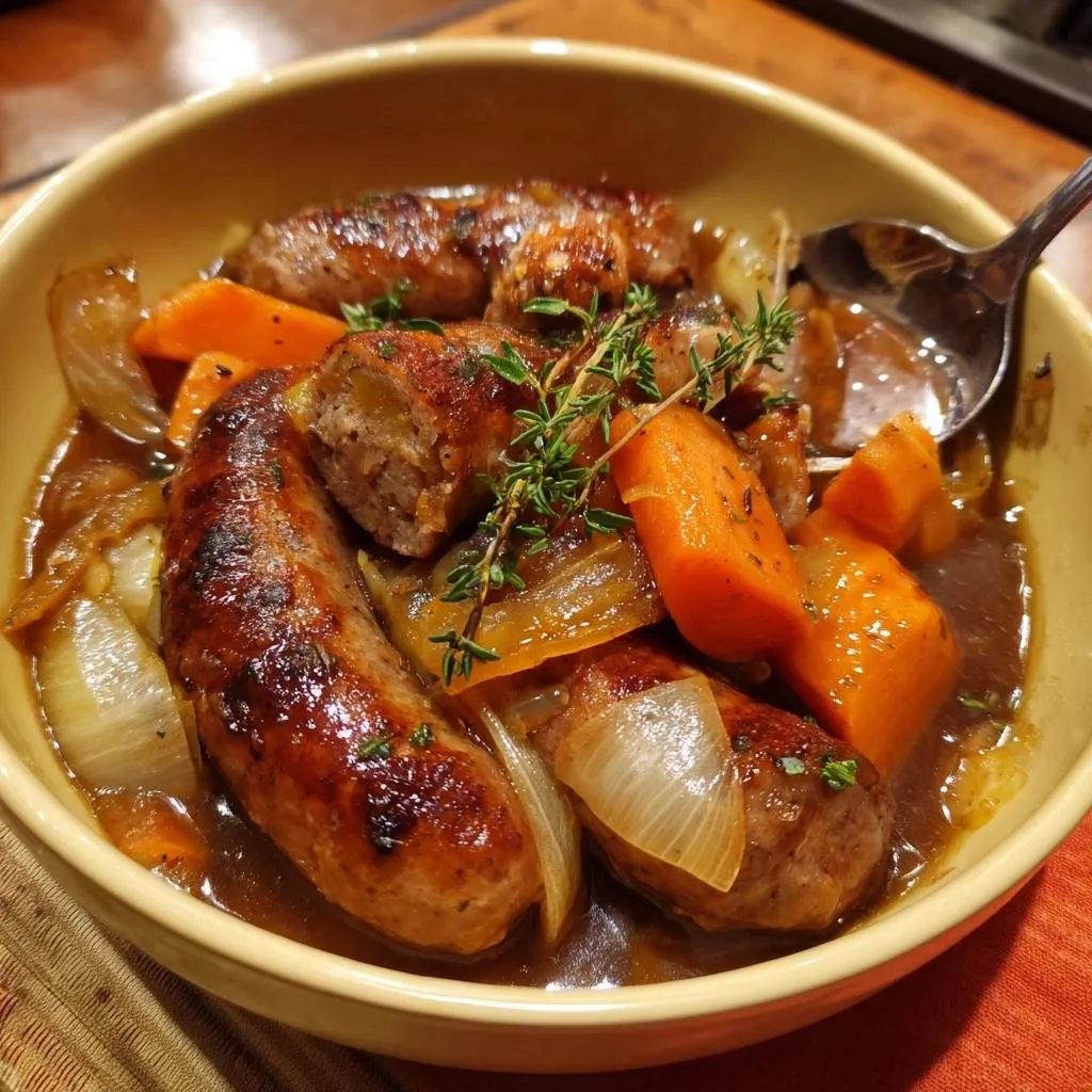 Foolproof one-pot sausage stew with sear-first method for plump, juicy sausages every time. No more dry or burst sausages!