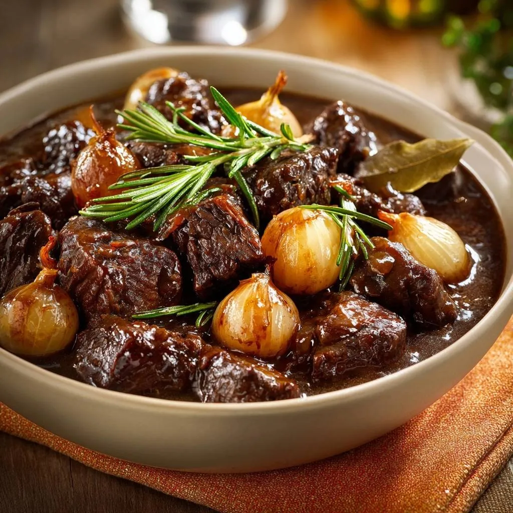 Tender, fall-apart beef stew with pearl onions, rosemary, and bay leaves. Sear-then-braise method guarantees juicy, flavorful results every time.