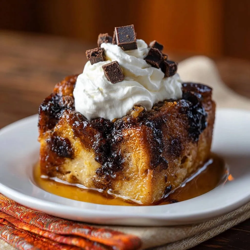 Perfect bread pudding with toasted cubes for no soggy centers, caramel sauce, crunchy pecans, whipped cream, and chocolate shavings.