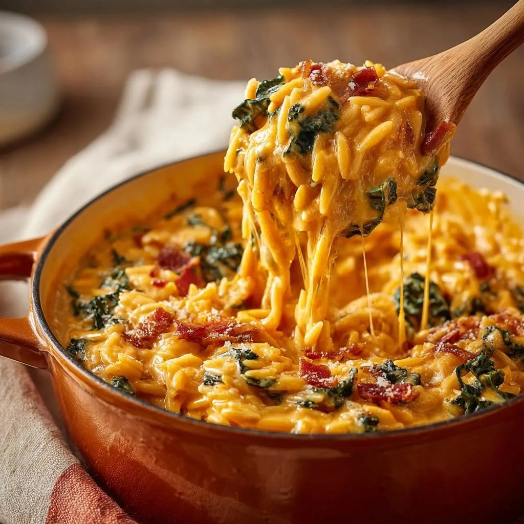Foolproof one-pot cheesy bacon kale orzo with perfect al dente texture from toasting pasta in butter. Creamy, crunchy, and healthy!