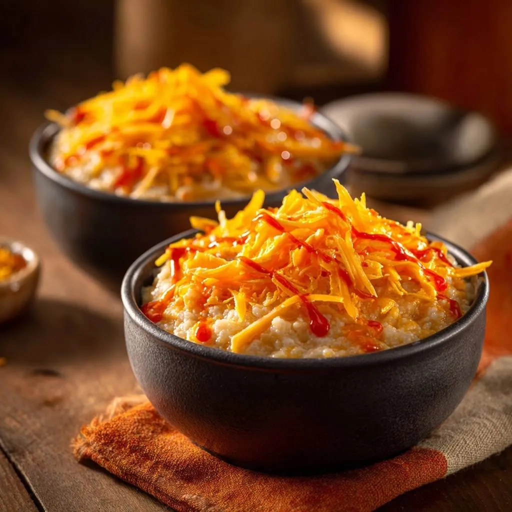 Ultra-creamy, lump-free grits topped with melty cheddar cheese and spicy hot sauce for the perfect comfort bowl.
