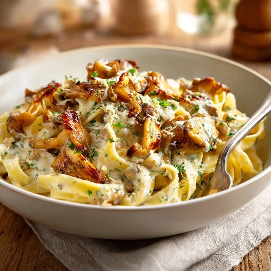 Creamy mushroom pasta with crispy, meaty mushrooms seared on high heat and a silky garlic cream sauce clinging to wide noodles.