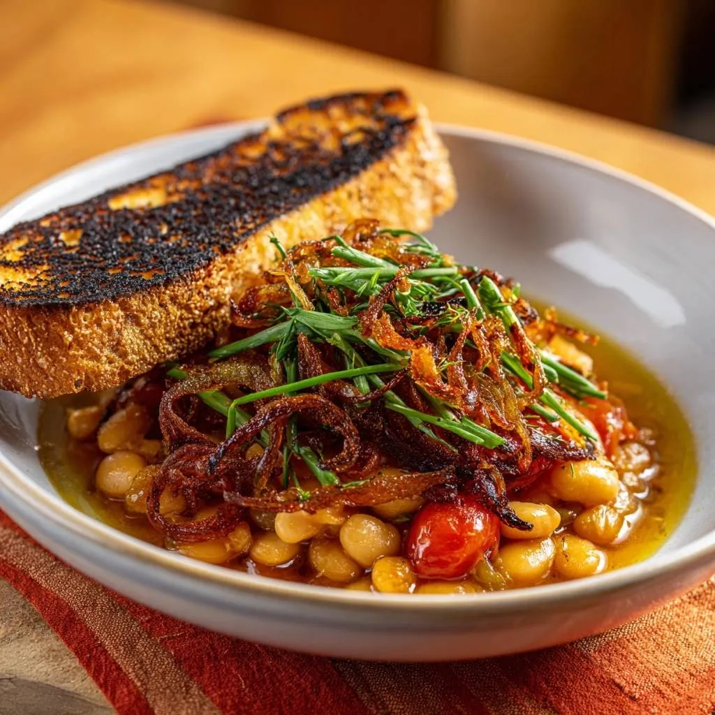 Creamy stewed white beans with burst cherry tomatoes, topped with foolproof crispy shallots and served with charred bread for dipping.