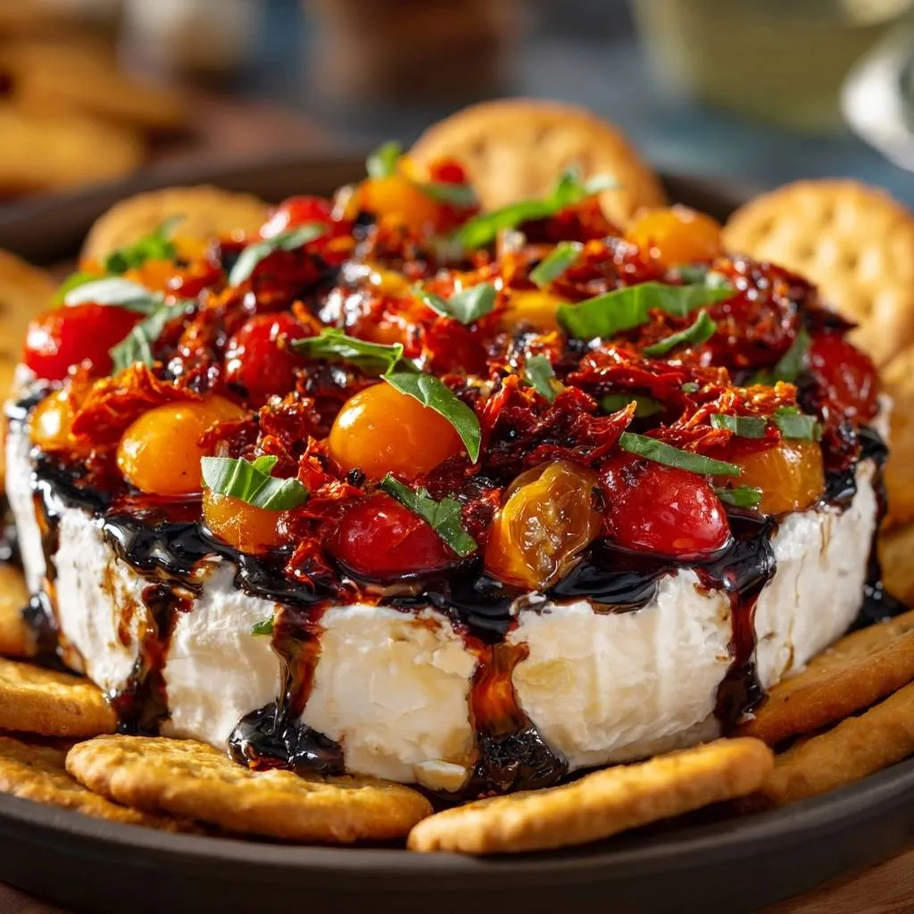 Perfect baked brie with balsamic roasted cherry tomatoes and sun-dried tomatoes for a thick, glossy, non-watery topping that stays perched on gooey brie.