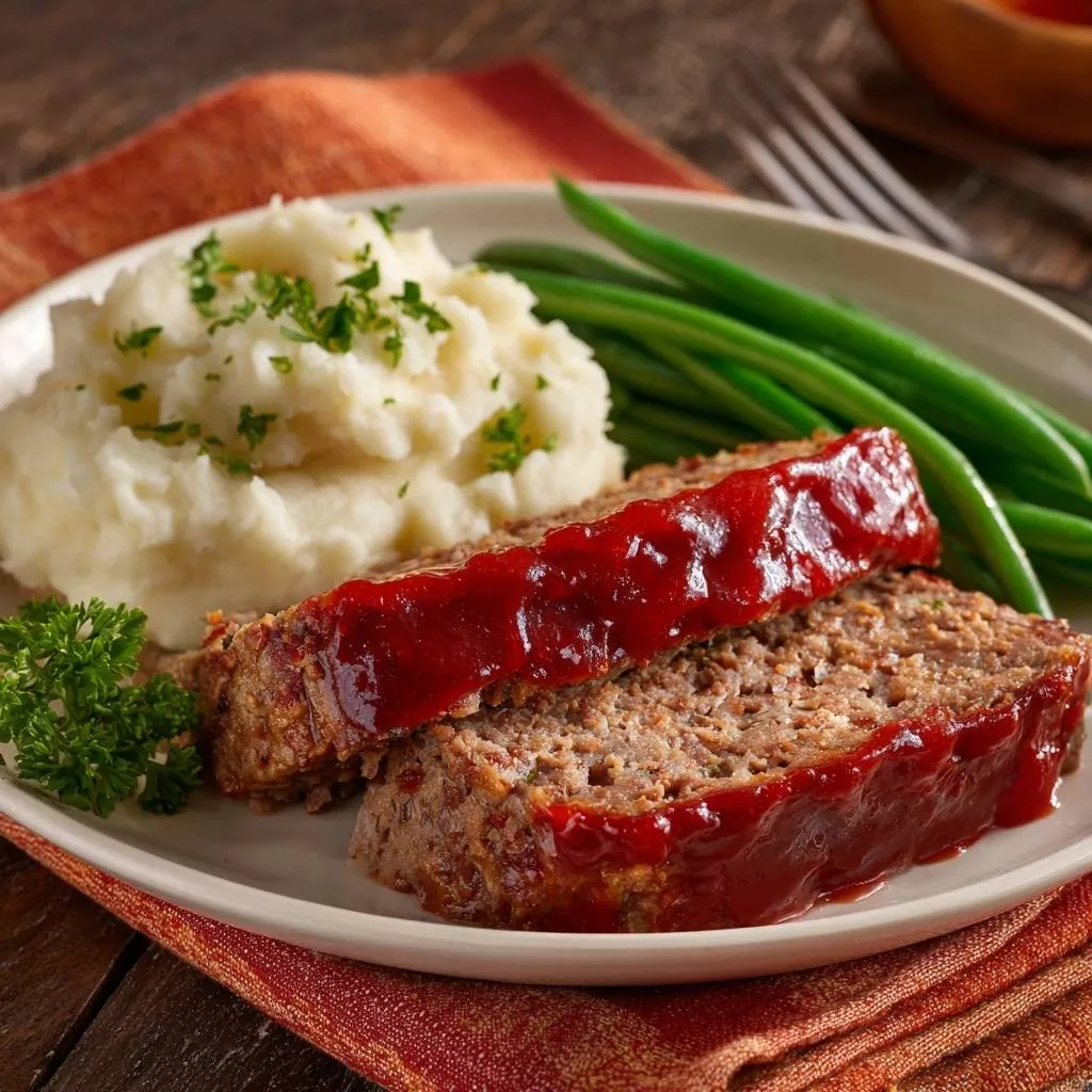 Foolproof meatloaf with milk-soaked breadcrumbs for juicy tenderness, served with creamy mashed potatoes and crisp green beans.
