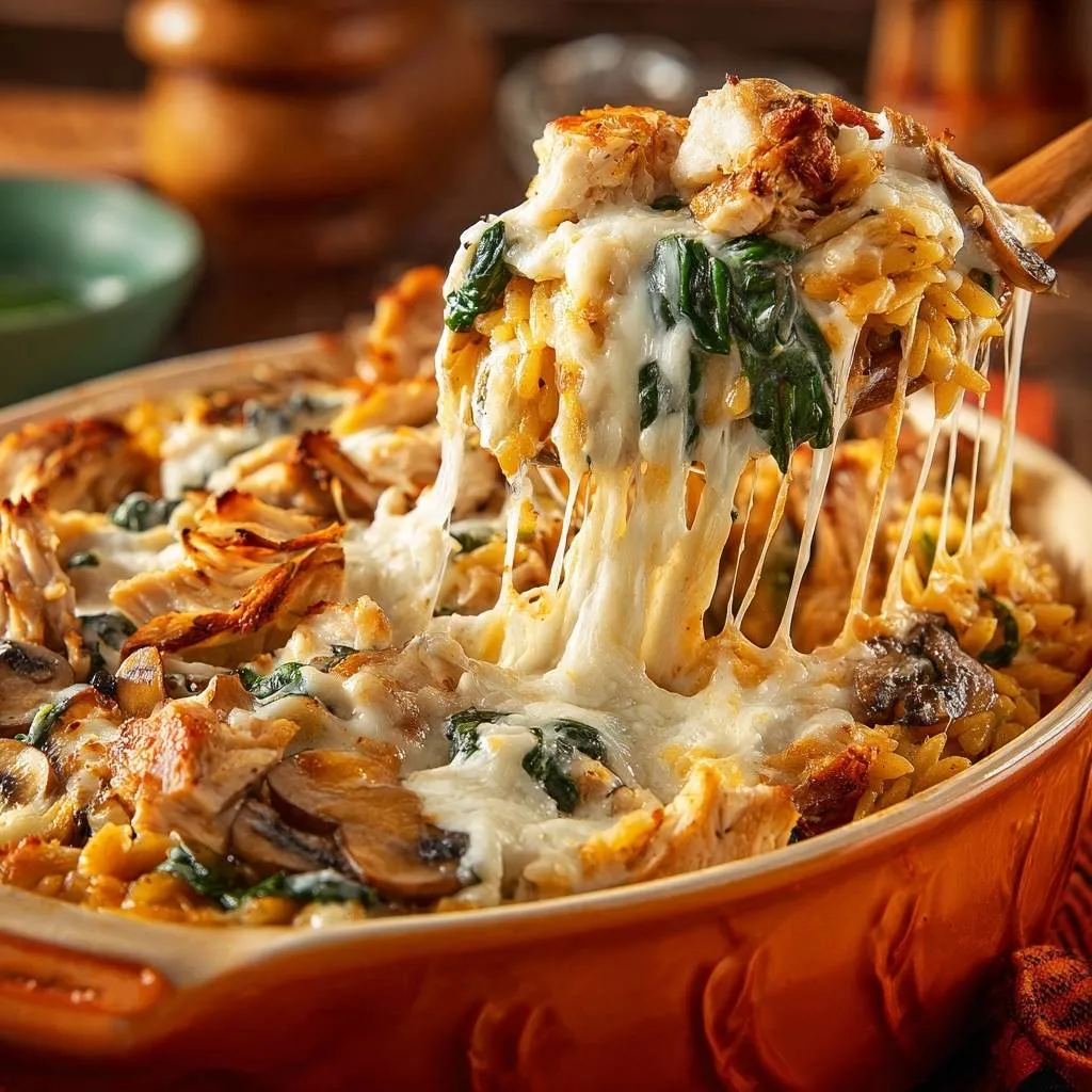 Cheesy Chicken Mushroom Spinach Orzo Bake