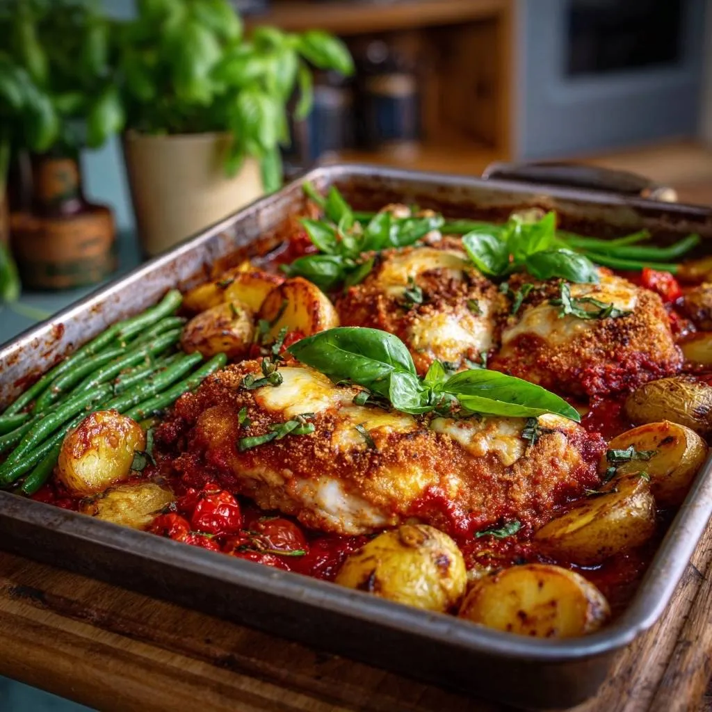 Crispy breaded chicken parmesan baked on a sheet pan with roasted potatoes, green beans, and cherry tomatoes in rich tomato sauce. No soggy breading!