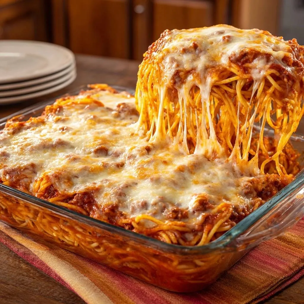 Moist cheesy baked spaghetti with ground beef and marinara, baked to perfection with a steam-trapping method for no dry pasta.
