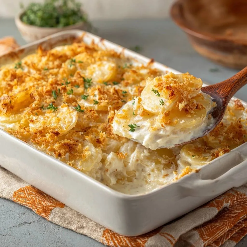 Foolproof scalloped potatoes with creamy interior and golden crunchy breadcrumb topping. No more sogginess!