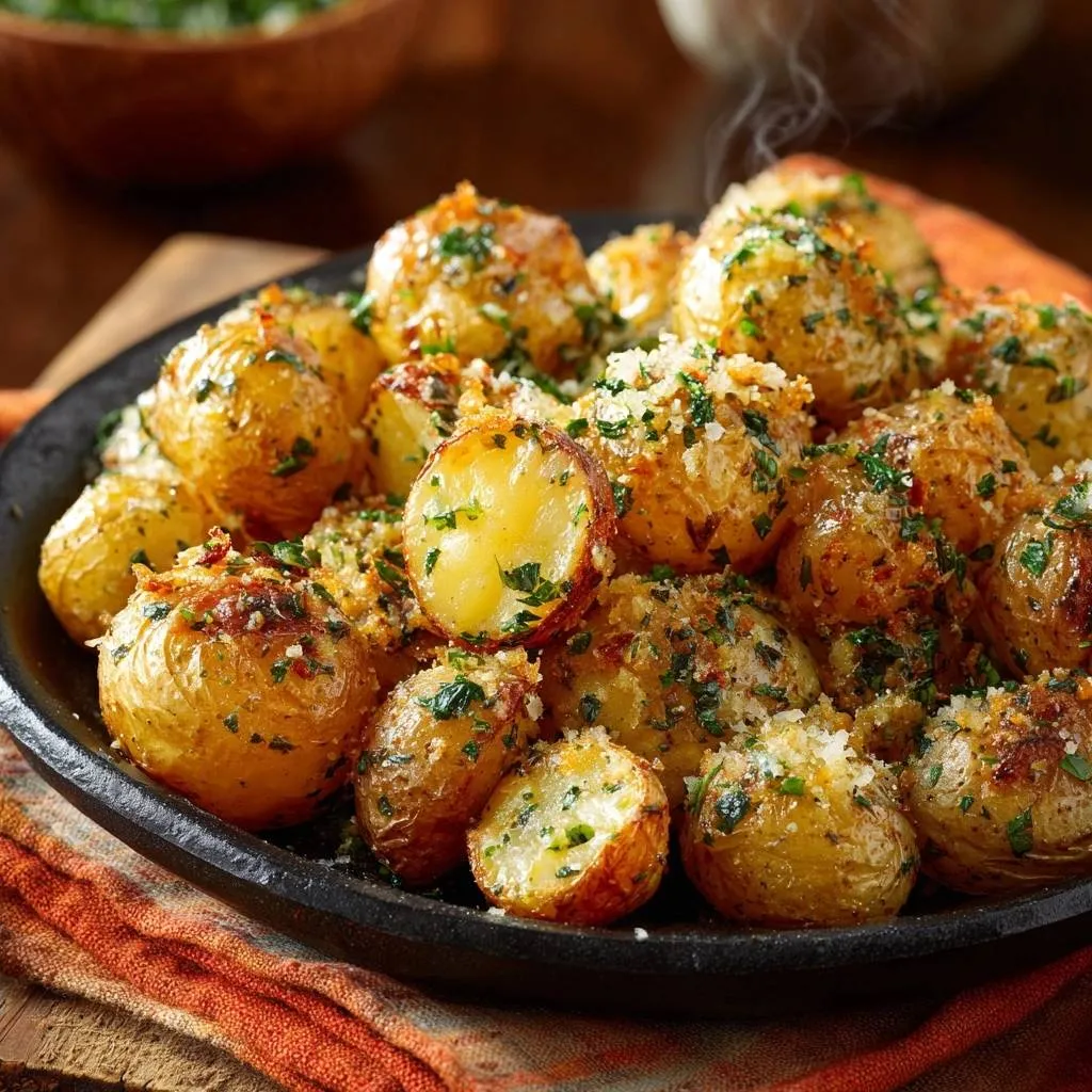 Crispy roasted baby potatoes with garlic, Parmesan, and parsley. Parboil and rough-up trick ensures fluffy centers and shatteringly crisp skins every time.