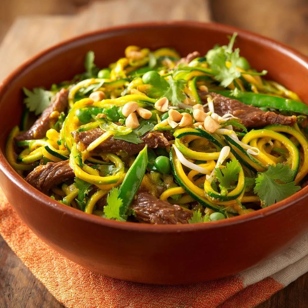 Tender beef, crisp veggies, and zucchini noodles in a flavorful yellow curry sauce. Low-carb stir-fry with a trick for perfectly crisp zoodles.
