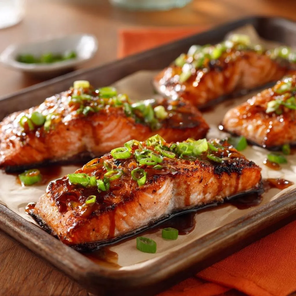 Juicy oven-baked teriyaki salmon with a caramelized glaze. Skin-side down on parchment paper locks in moisture for perfect results every time.